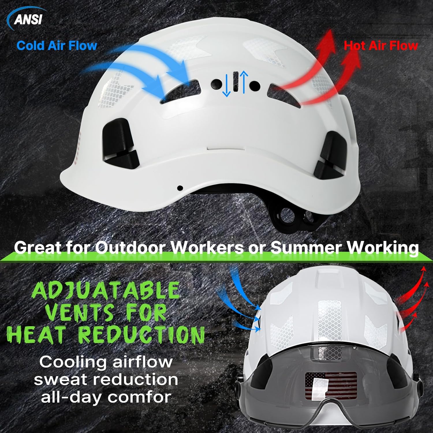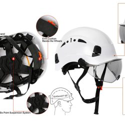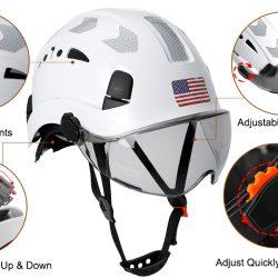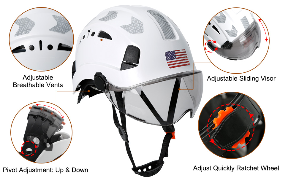 Ajuste ajustable y cómodo: sistema de suspensión ajustable de 6 puntos para una mejor absorción de impactos y comodidad general. Correa de barbilla cómoda y conveniente de estilo taza suave para mayor seguridad y estabilidad, se quita libremente. Equipado con un paquete de adhesivos reflectantes para casco, proporciona una protección segura en trabajos al aire libre en la oscuridad. Visera de humo fácil de levantar que proporciona protección para los ojos en la luz solar intensa y protección contra escombros