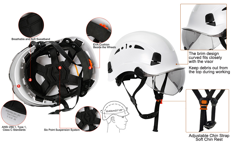 El casco de seguridad AOLAMEGS está hecho de materiales ABS resistentes a la penetración de alto impacto, ligero, fuerte y cómodo. Una buena opción para proteger las cabezas contra objetos que caen, impactos, golpes y rasguños. Los cascos de seguridad AOLAMEGS cumplen con las normas ANSI Z89.1-2014 Tipo I Clase C, las viseras cumplen con las normas ANSI Z87.1-2015