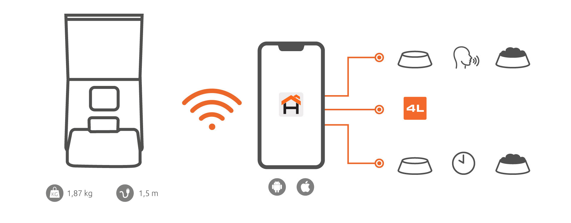 - Capacidad de 4 L: El depósito de gran capacidad almacena alimento seco para varios días — ideal para mascotas pequeñas y medianas.