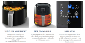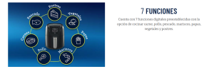 - Cuenta con 7 funciones digitales preestablecidas para cocinar pollo, pescados, mariscos, carnes, papas fritas, vegetales y postres