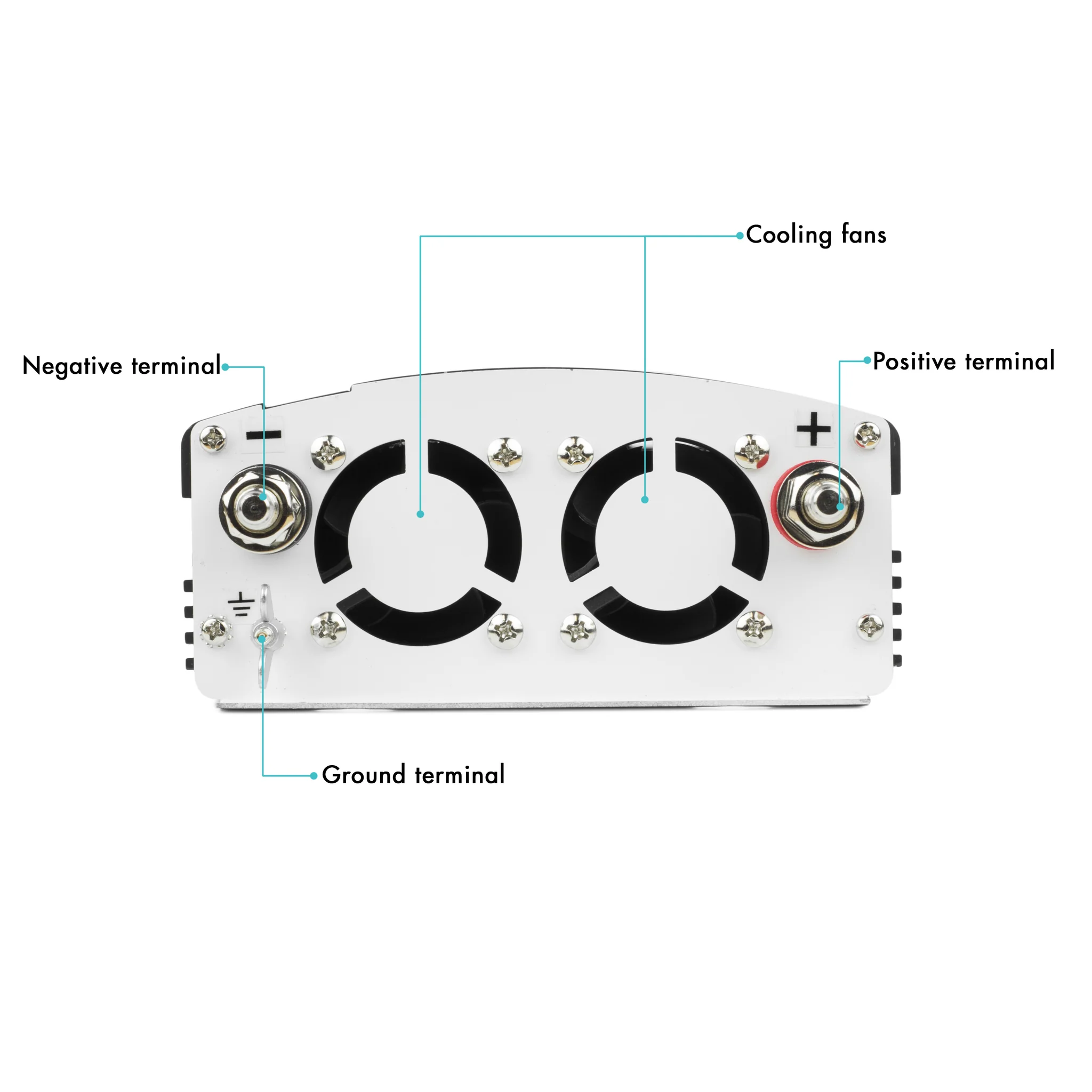 La parte trasera del inversor SlimLine de 2000 W ofrece: terminal de batería roscado negro (negativo), terminal de batería roscado rojo (positivo), terminal de unión de neutro a tierra (tuerca de mariposa), brida de montaje y los dos ventiladores de enfriamiento térmico.
