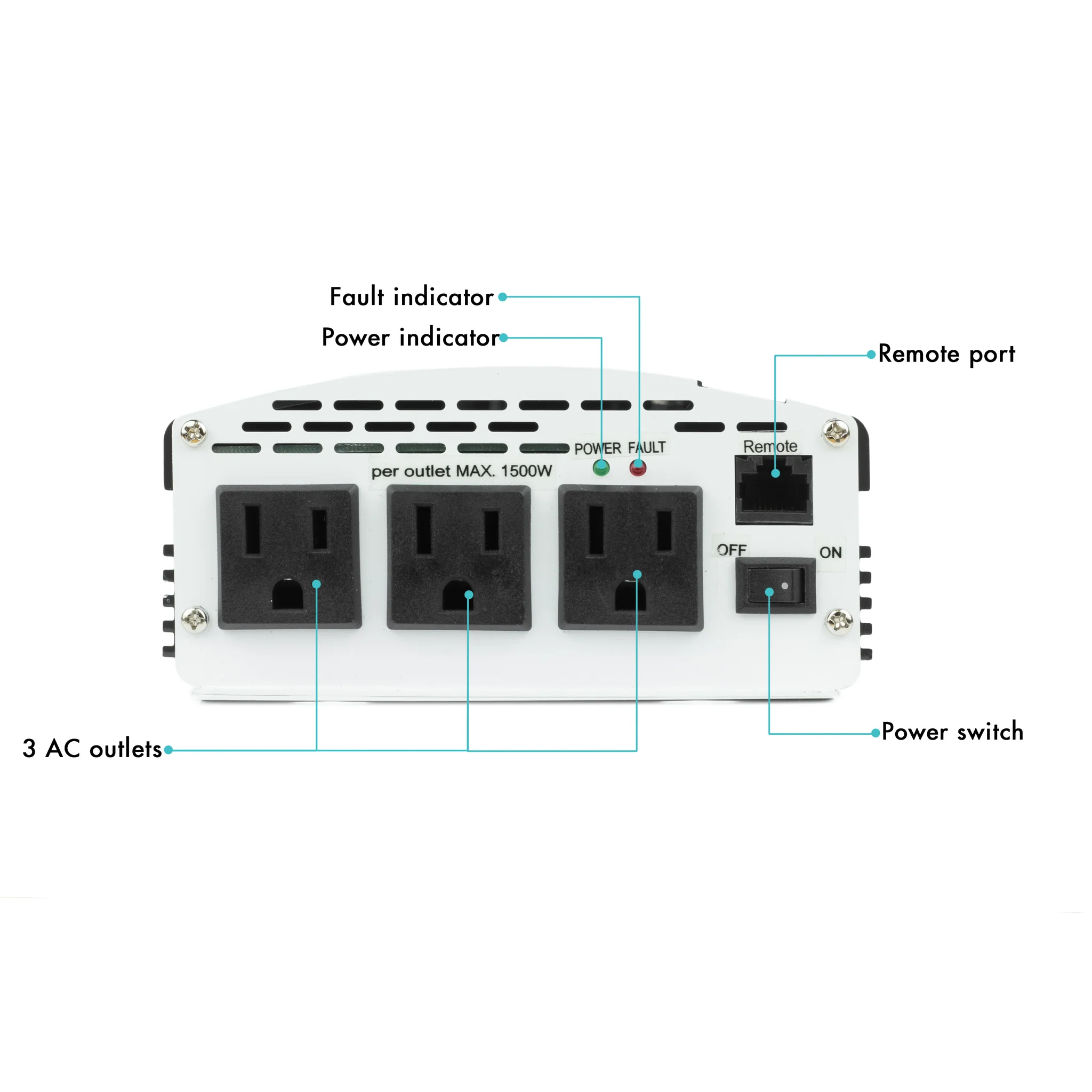 En la parte frontal del inversor SlimLine de 2000 W, encontrará 3 tomacorrientes de CA estándar de EE. UU. de 3 clavijas, puerto remoto, luz LED de falla roja, luz LED de alimentación verde, rejillas de ventilación, interruptor de alimentación y la brida de montaje frontal.