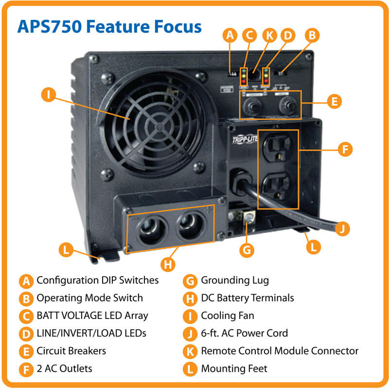 Diseñado para fácil instalación en vehículos recreativos, camiones de carretera, vehículos de flotilla y vehículos de emergencia, el APS750 convierte la energía almacenada de cualquier batería de 12V o fuente automotriz de CD en energía de CA segura, estable de grado computación durante un tiempo de operación ilimitado. Cuando se ailmenta mediante una fuente externa de 120 V CA, la unidad mantiene cargada la batería suministrada por el usuario mediante un sistema de carga 20A de tres etapas mientras entrega simultáneamente energía de CA al equipo conectado