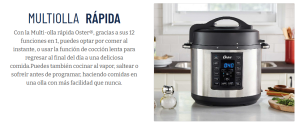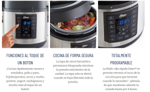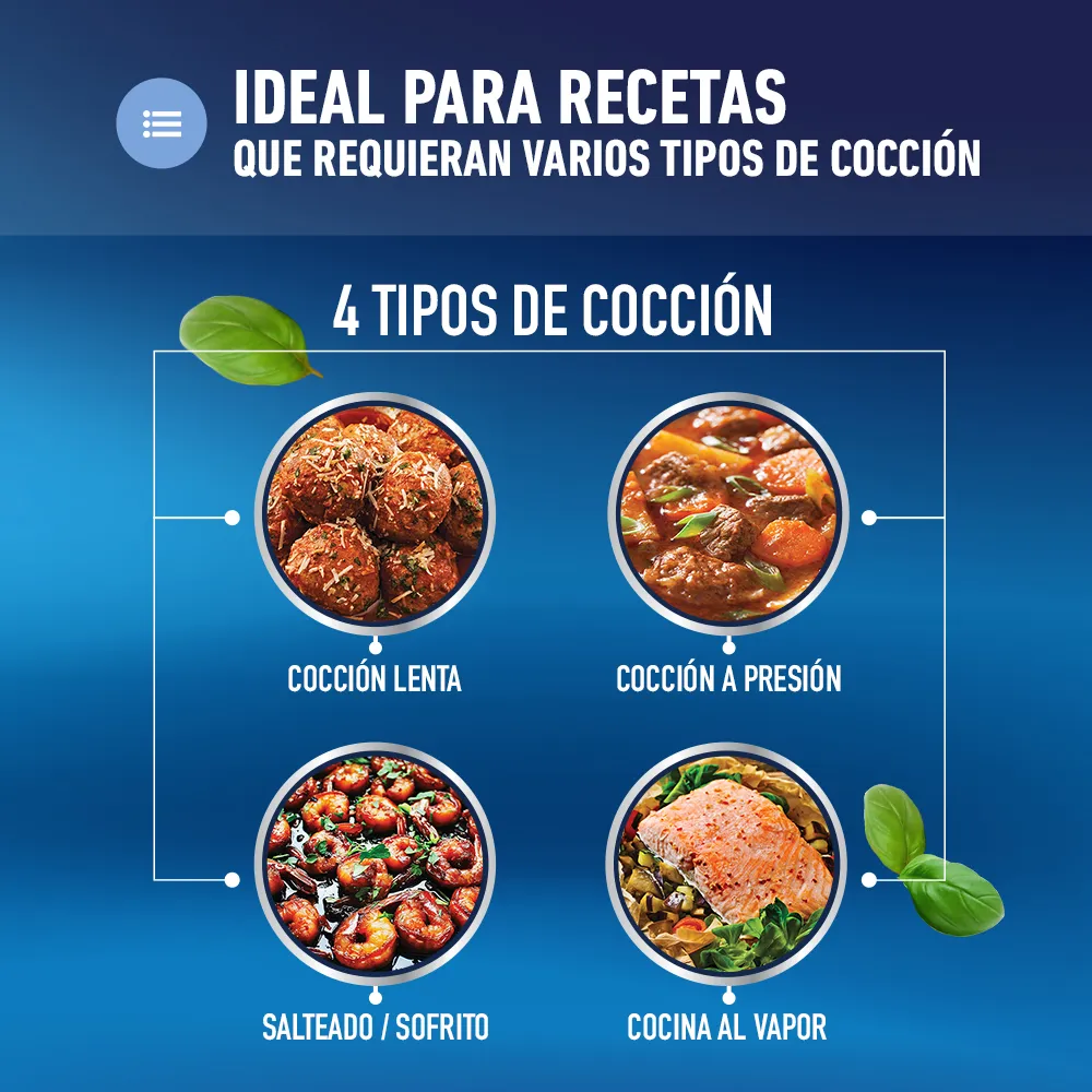 - cocina rápidamente carnes, estofados, pollo y pavo, granos, arroz, postres y mucho más, utilizando las funciones pre-configuradas para cocinar a presión, cocción lenta, a vapor o sofreír