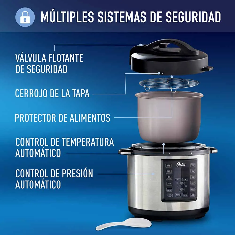 - Cocción con seguridad, ya que la tapa de cierre hermético permanece bloqueada mientras la presión está dentro de la olla. La tapa solo se abre cuando toda la presión ha sido liberada