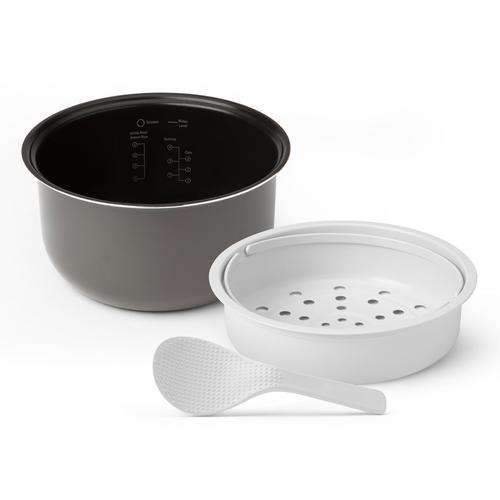 La olla tiene capacidad para hasta 5 cucharadas de arroz o granos secos a la vez. La canasta para cocinar al vapor incluida se puede apilar sobre los granos para cocinarlos simultáneamente o se puede usar sola con el programa “Cocinar al vapor”.