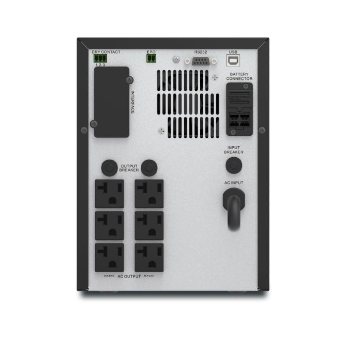 Sistema de energía ininterrumpida (UPS) interactivo en línea de 2KVA (1400W) 6 salidas NEMA 5-20R y cordón con espiga NEMA 5-20P, pantalla LCD inteligente Texto y diagramas mímicos que muestran modos de operación, parámetros de sistema y alarmas, alarmas sonoras, puerto serial, puerto USB y puerto inteligente.